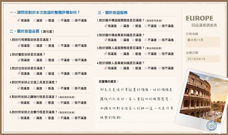 邱先生是位非常敬業的領隊,好的領隊讓旅行社成功,客人尊敬他的服務、他的態度、知識及他對每位客人的細心!這一次是非常快樂的假期