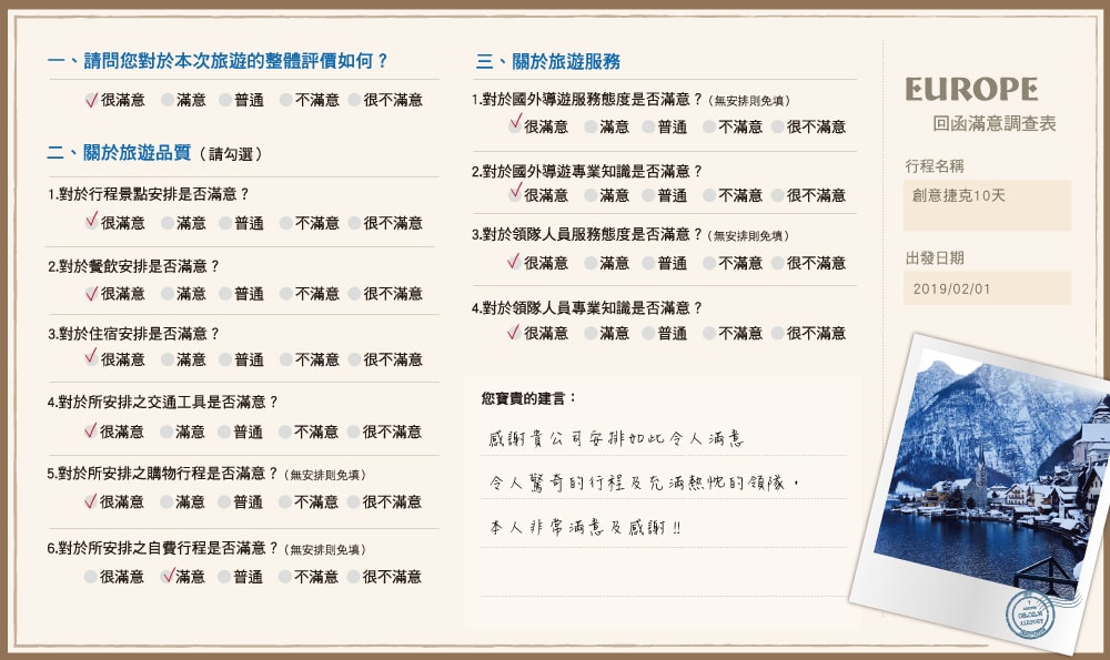 感謝貴公司安排如此令人滿意令人驚奇的行程及充滿熱忱的領隊,本人非常滿意及感謝!!