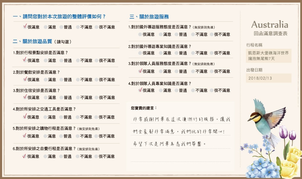 非常感謝阿華在這次澳洲行的服務,讓我們全家都非常滿意,我們玩...