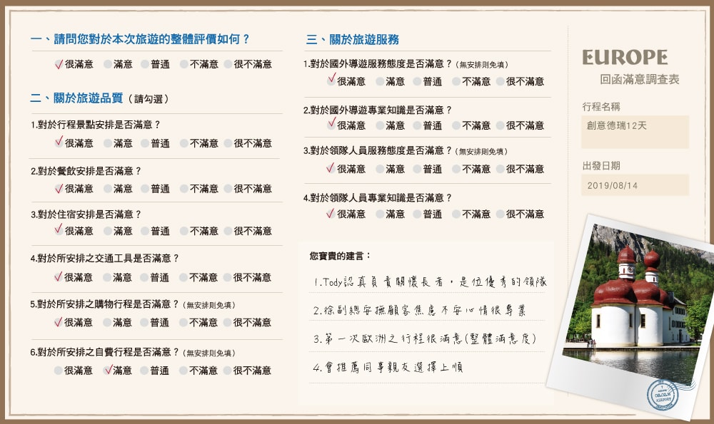 1.Tody認真負責關懷長者,是位優秀的領隊 2.徐副總安撫顧客焦慮不安心情很專業 3.第一次歐洲之行程很滿意(整體滿意度).....