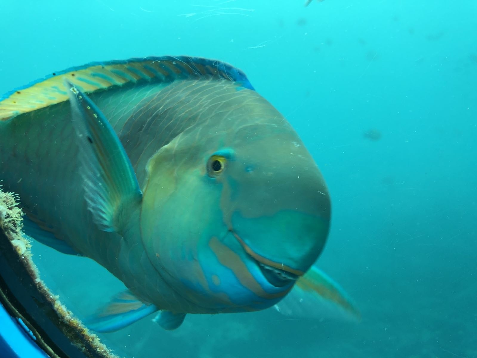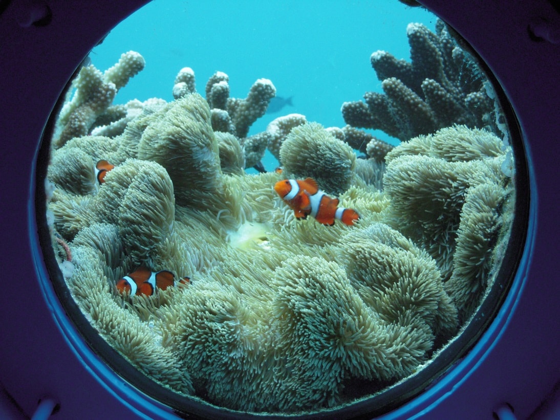 由船中底部的透明玻璃觀望窗窺視海底,在珊瑚礁中游來游去的熱帶魚就如同在桌面上一樣,近在眼前。